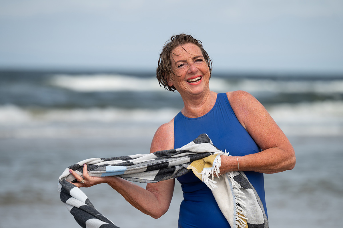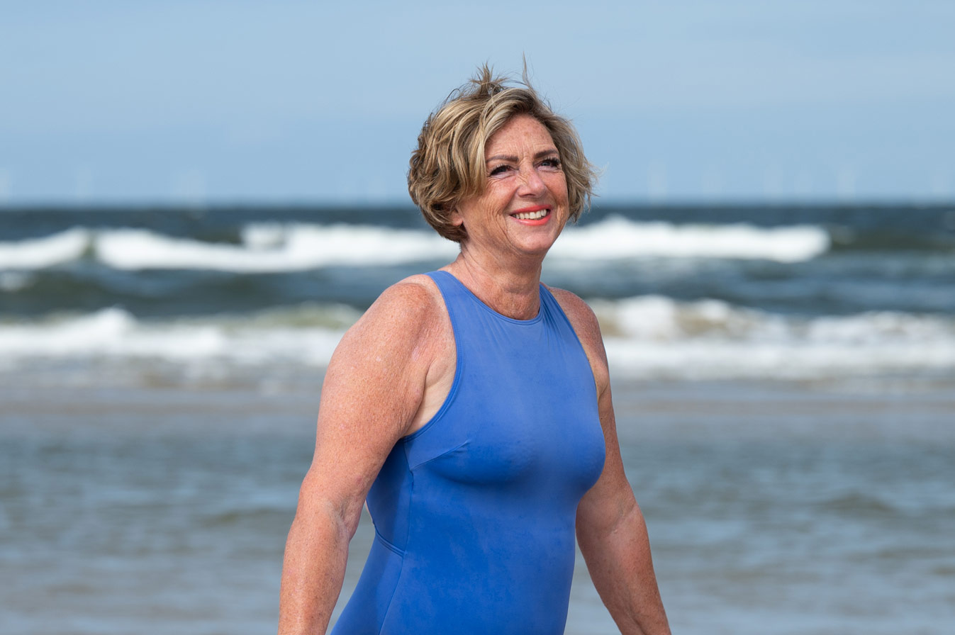 “Mijn moeder zei vroeger altijd: ‘Marianne, niet met natte haren naar buiten. En als je gezwommen hebt, doe je je jas helemaal dicht.’ En nu loop ik zomer en winter in mijn badpak over het strand, 3 à 4 keer per week neem ik een duik in zee. Ik ben er zo’n negen jaar geleden mee begonnen en het is een van de beste dingen die ik ooit ben gaan doen.
